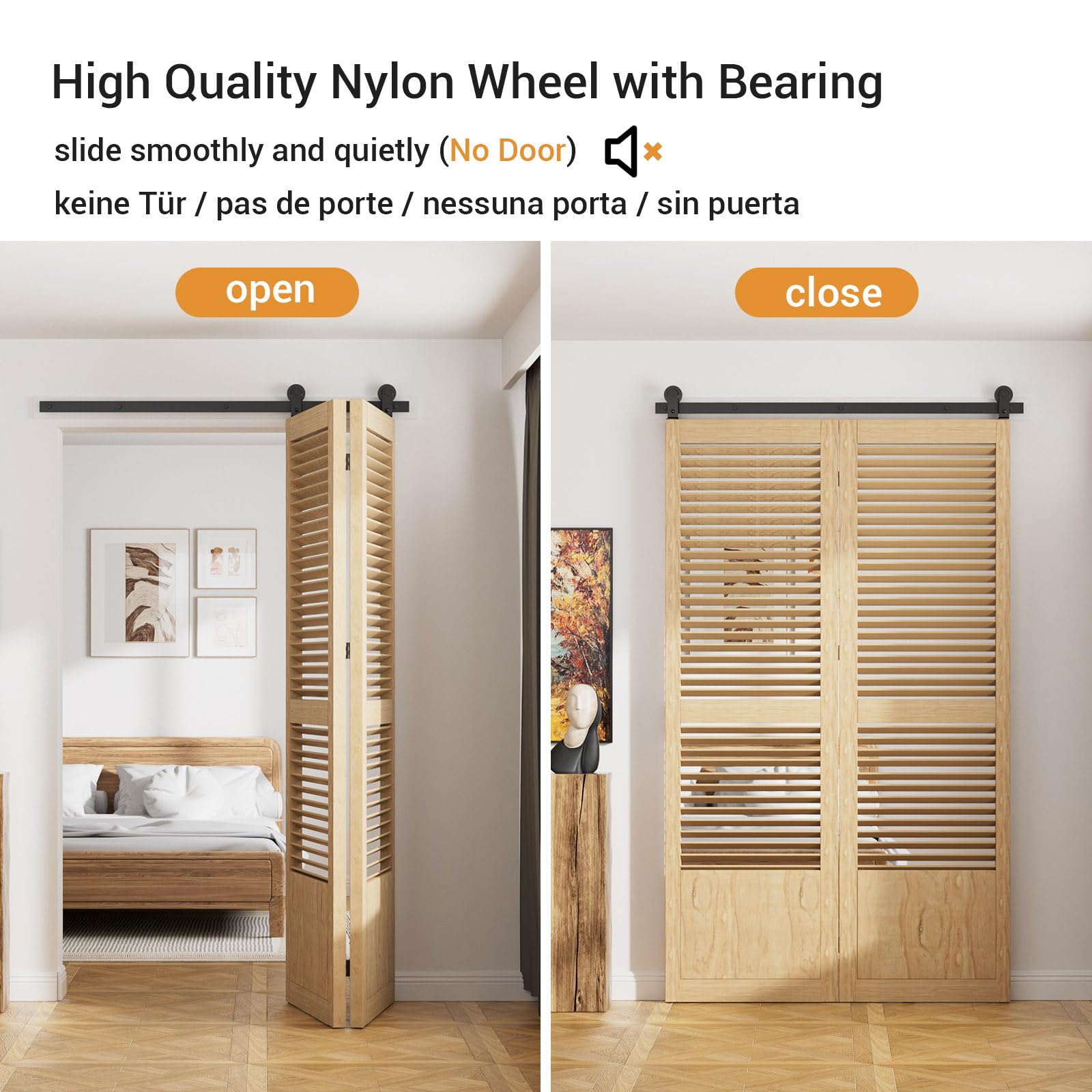 BONIKLUBA 76cm-203cm Bi-Folding Schiebetür Hardware Kit für 2-Türen, gleiten Sie sanft leise, schwarze Spur T Form Roller [Keine Tür enthalten]