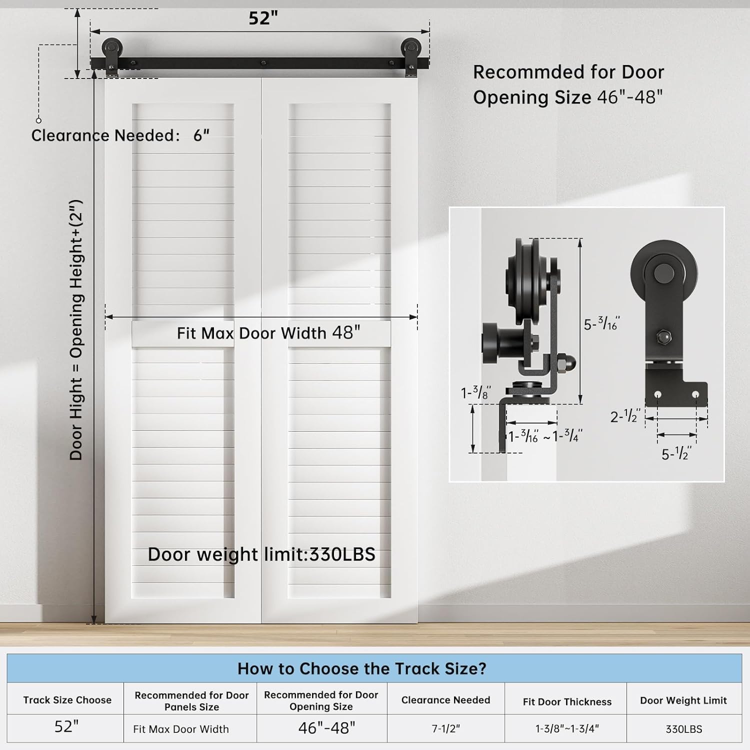 - Friendly to Space: Bi-folding sliding barn door hardware kits does not require extra wall space to open the door; 52" guide ≤ 47" door opening; suitable for door thickness: 1-3/8" to 1-5/8"; The top edge of the door and the ceiling=5"; Guide load bearing: 330LBS; Gap between wall and door = 2"+(door panel thickness).
