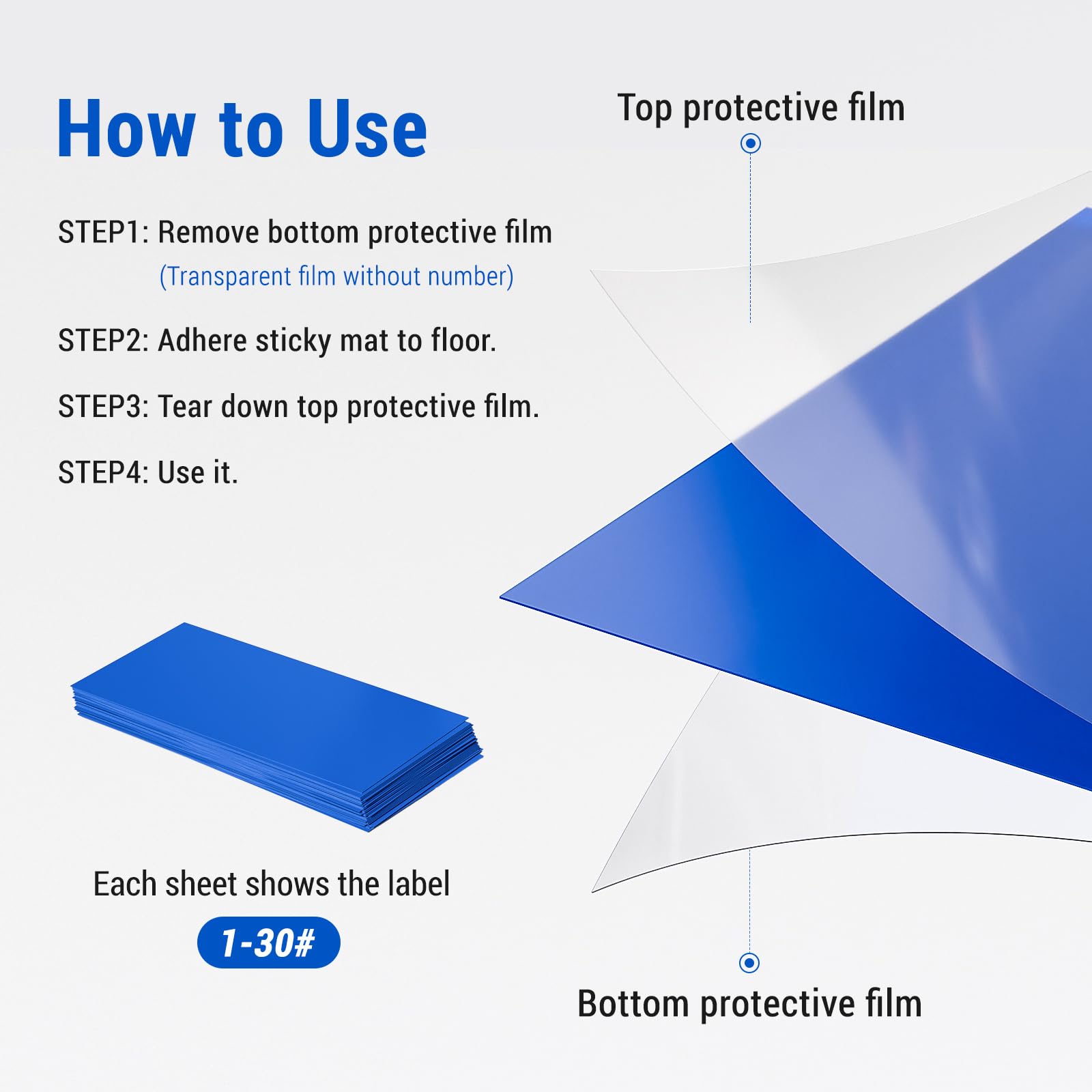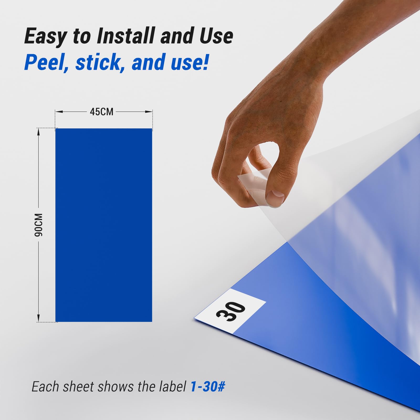 - Einfach zu bedienen: Peel, Stick, und benutzen! Die untere Ecke jedes Klebeteppichs zeigt das Etikett 1-30 # für einen einfachen Austausch. Entfernen Sie den unteren Schutzfilm des Klebeteppichs, kleben Sie den klebrigen Teppich auf den Boden, entfernen Sie die obere Schutzfolie.