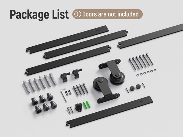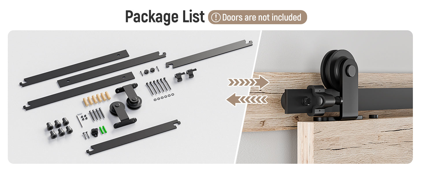 - [Paket beinhaltet]: Komplettes Scheunentor-Hardware-Kit (Spleißen einer 183-cm-Schiene, Schienenabstandshalter, 2 x Rollen, 2 x Türstopper, 2 x Anti-Sprung-Scheiben, 1 x T-förmige Bodenführung, 1 x Sechskantschlüssel) * Tür nicht enthalten.