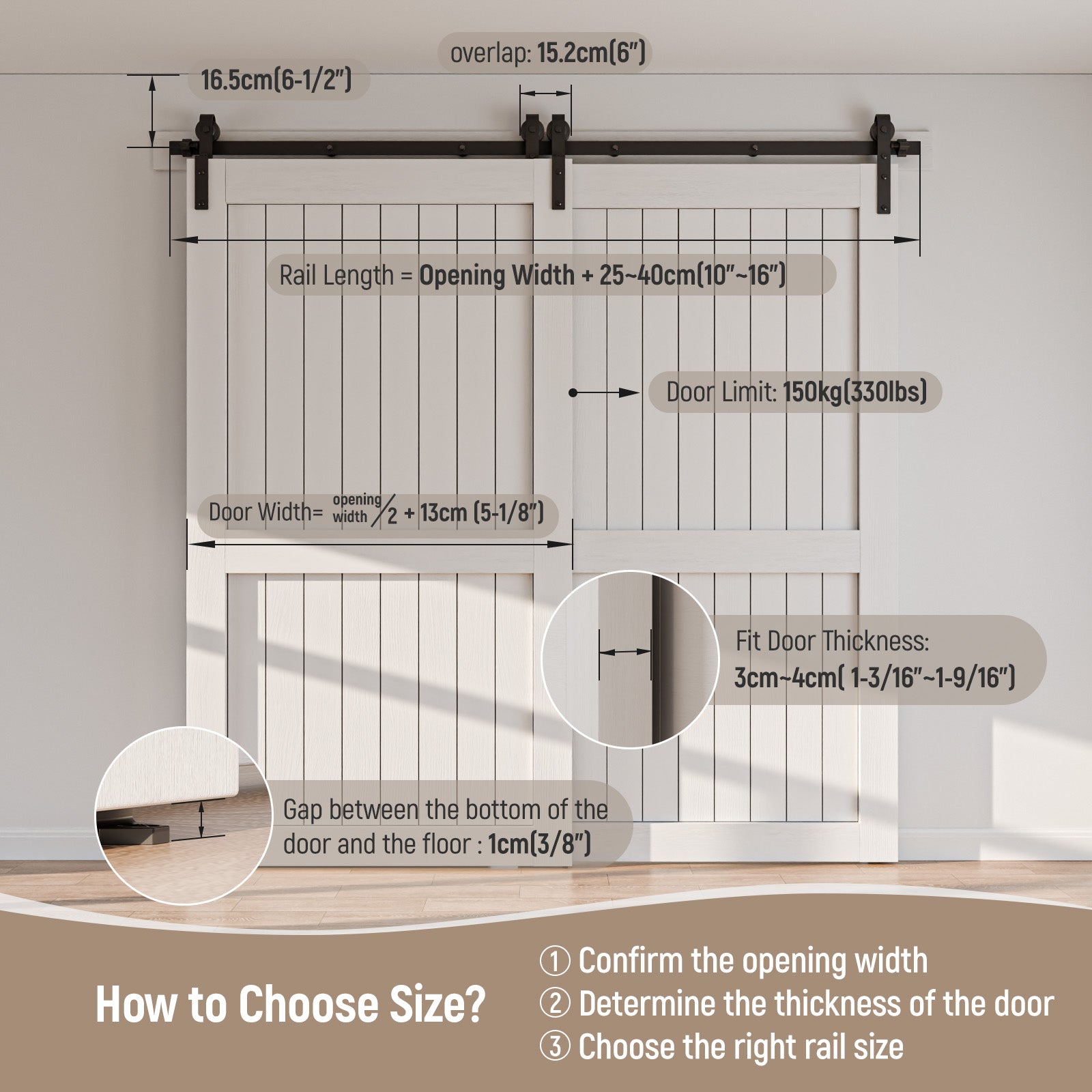 - Türgewichtskapazität --- 150kg, 5FT Bypass Double Barn Door Hardware Kit für 3cm-4cm dicke und 70cm breite Türen. Der Abstand über der Oberseite der Tür benötigt min. 16cm.