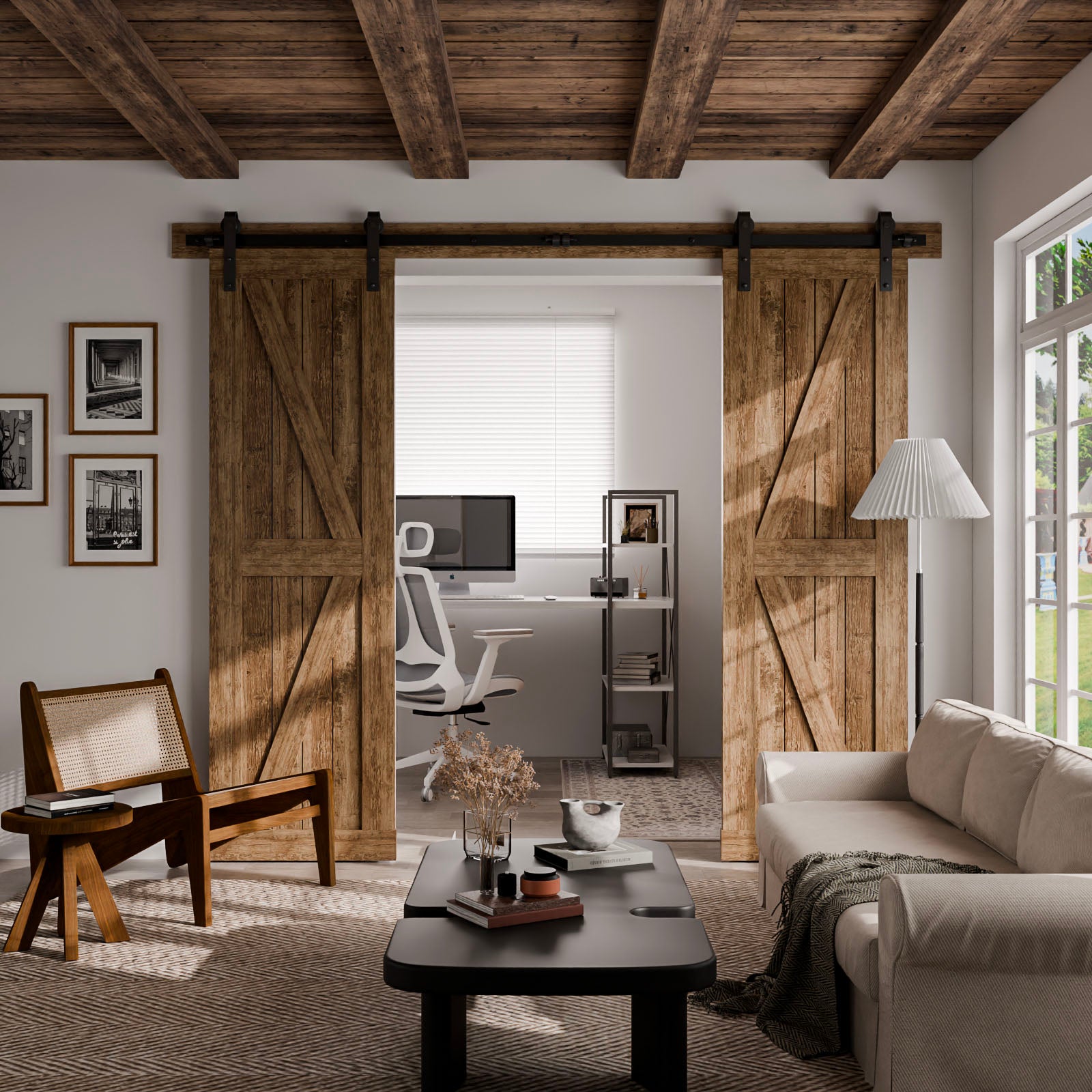 - [Vorteil für Ihr Haus]: 1. Dieses Dekor ergänzt den modernen Stil mit klassischem Scheunentor; 2. Spart nicht nur Platz, sondern ermöglicht auch das Öffnen mehrerer Räume ohne Schwingtür.