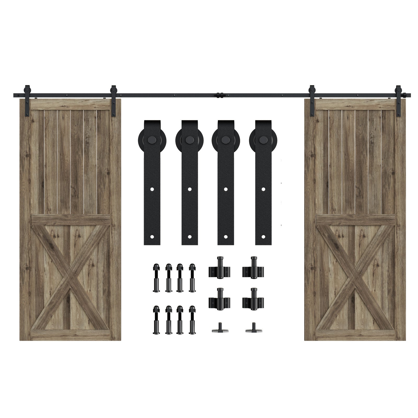 Schiebetürbeschlag Doppeltür 366cm Schiebetüren Schiebetürsystem Komplettset Laufschiene Rollen Set Schwarz für 2 Holztür 91cm Breit, Kleine Rolle in J-Form
