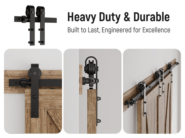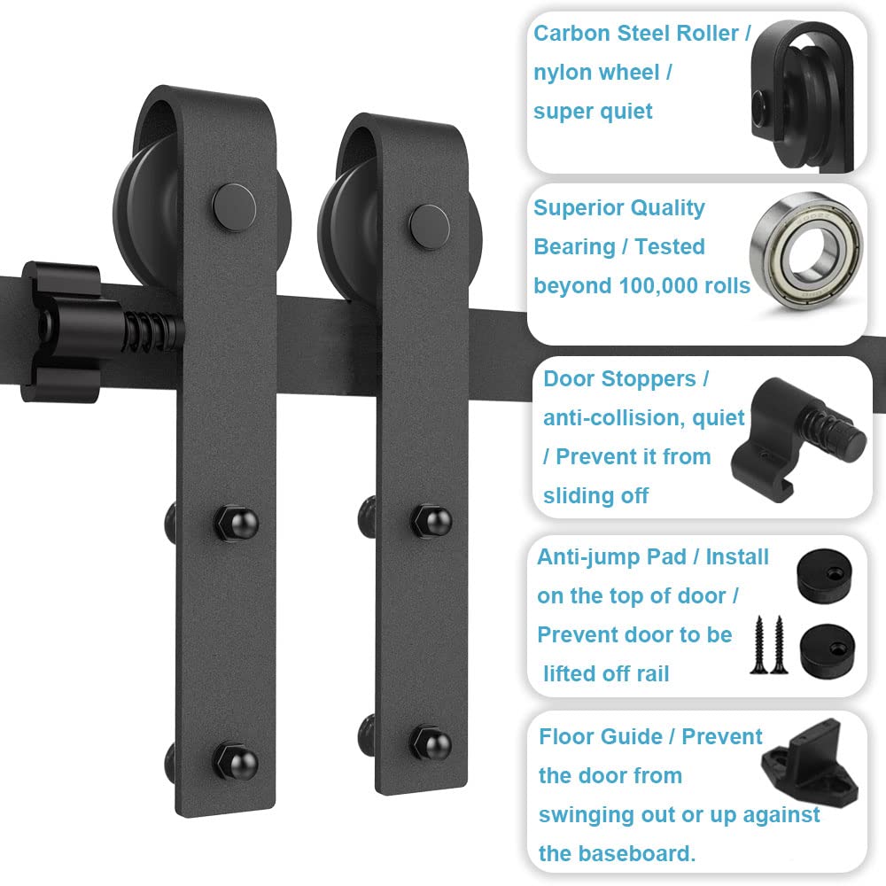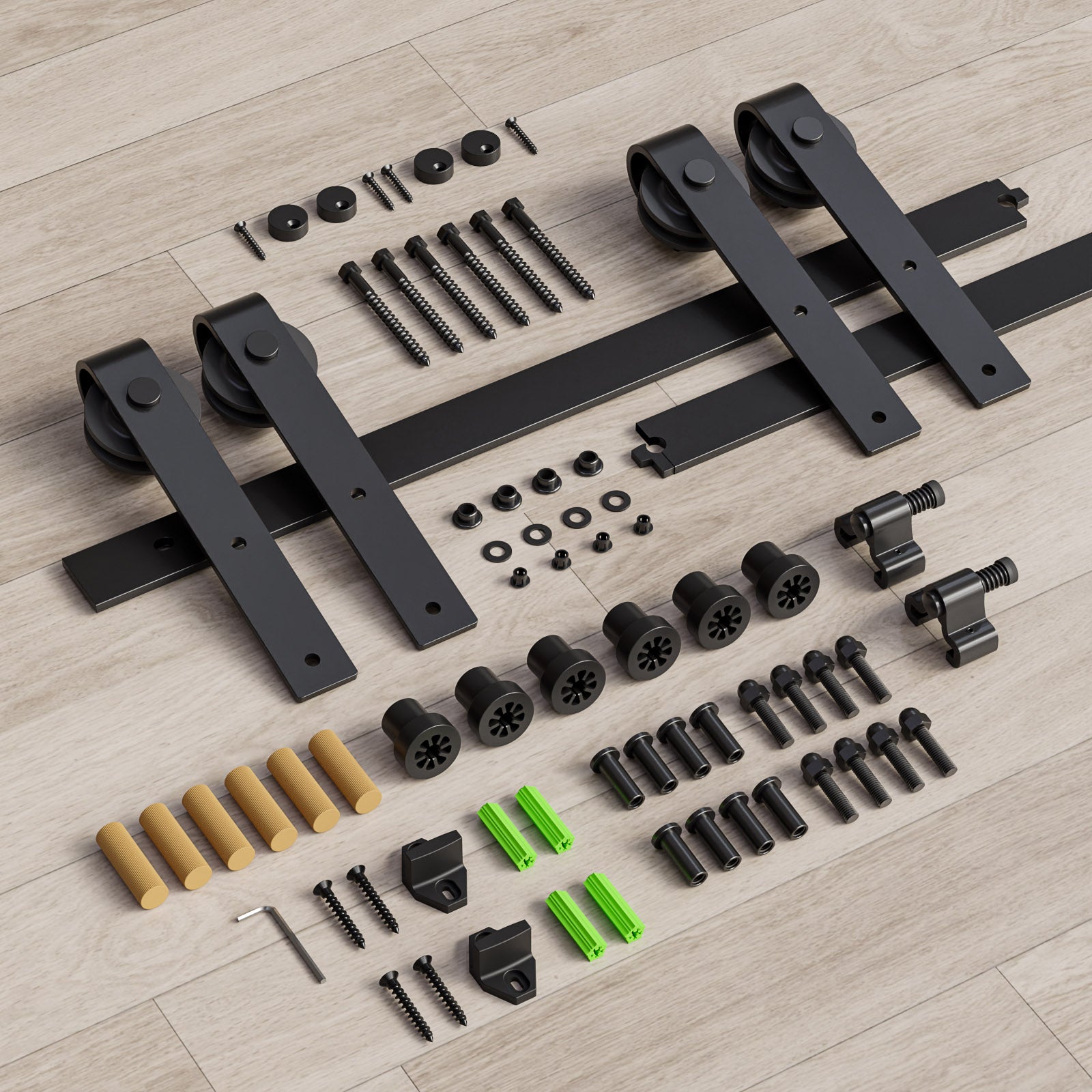 - [Paket beinhaltet]: Komplettes Scheunentor-Hardware-Kit (Spleißen von 396-cm-Schiene, Schienenabstandshalter, 4 x Rollen, 4 x Türstopper, 4 x Anti-Sprung-Scheiben, 2 x T-förmige Bodenführung, 1 x Sechskantschlüssel) * Tür nicht enthalten.
