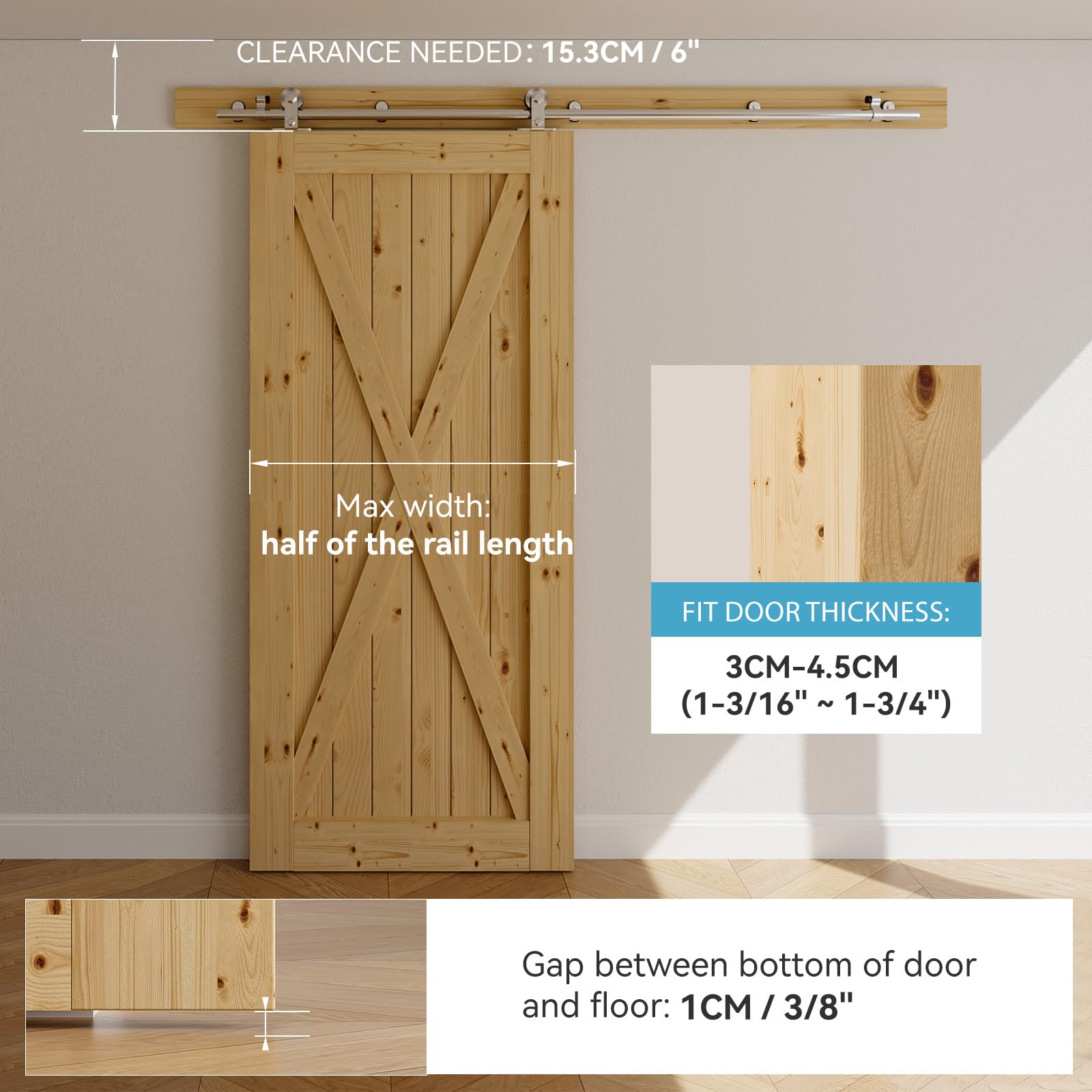 - [Paket beinhaltet]: Komplettes Scheunentor-Hardware-Kit (Spleißen einer 244-cm-Schiene, Schienenabstandshalter, 2 x Rollen, 2 x Türstopper, 2 x Anti-Sprung-Scheiben, 1 x T-förmige Bodenführung, 1 x Sechskantschlüssel) * Tür nicht enthalten.