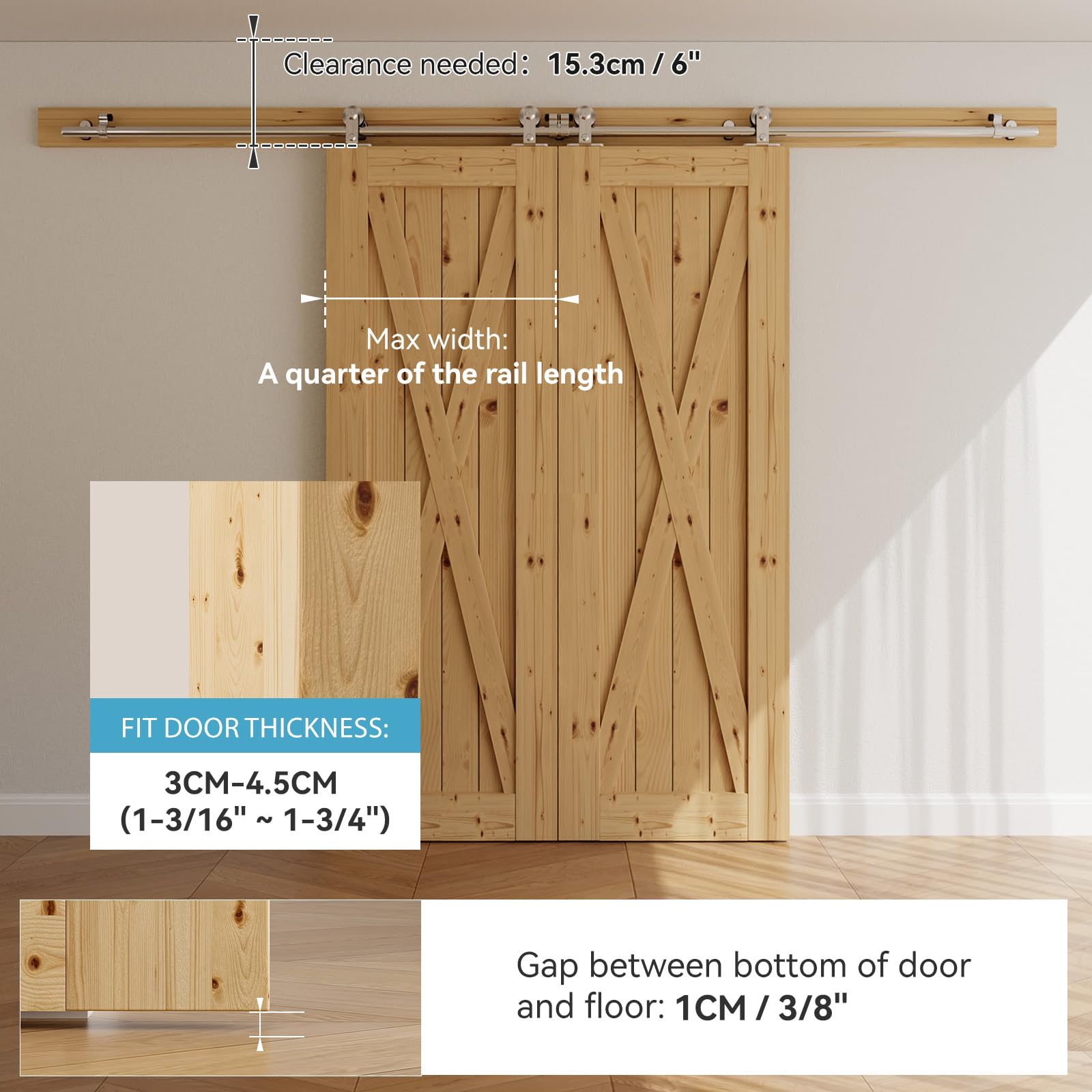 Schiebetürbeschlag Edelstahl Doppeltür 305cm Schiebetüren Schiebetürsystem Komplettset Laufschiene Rollen Set für 2 Holztür 76cm Breit, T Form